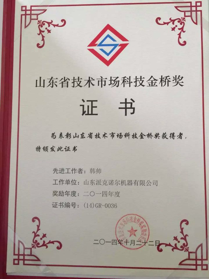 山東派克諾爾機器有限公司派克門窗幕墻研究中心主任韓帥,目前榮獲山東省技術市場科技金橋獎。這是派克機器科技人員參加山東省(國內首次舉辦)門窗設備技術市場發明創評選活動中獲得的“諾貝爾”獎。