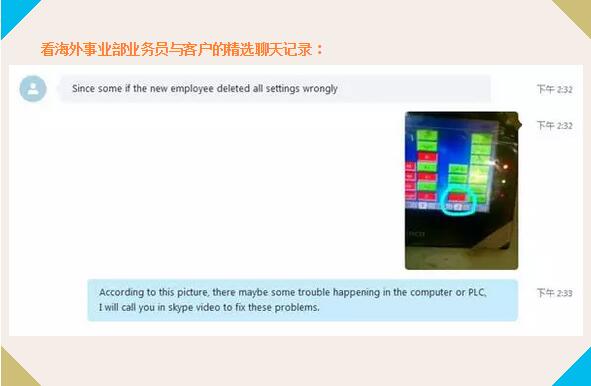 印度客戶,于2013年從派克購買數控清角機。近日,由于新員工誤操作,導致設備運行出現問題??蛻魪挠《饶沁叞l過來求助信息,海外事業部的業務員通過Skype與該客戶取得聯系,進一步了解設備故障出現的原因,故障出現時呈現的狀態等,再與技術工程師溝通交流,了解可能導致的原因以及用對措施,通過圖片、視頻,在線視頻等途徑進行跨國通話,最終發現問題出現在數控系統之中。于是,技術部和售后服務部齊心協力將解決方案以圖片以及視頻的方式多元素,多途徑展示給客戶,指導客戶如何編程,并編寫一套代碼數據發送過去,最終該清角機一切數據恢復正常,六把刀又重新正常流利工作(客戶與海外事業部業務員部分聊天記錄)